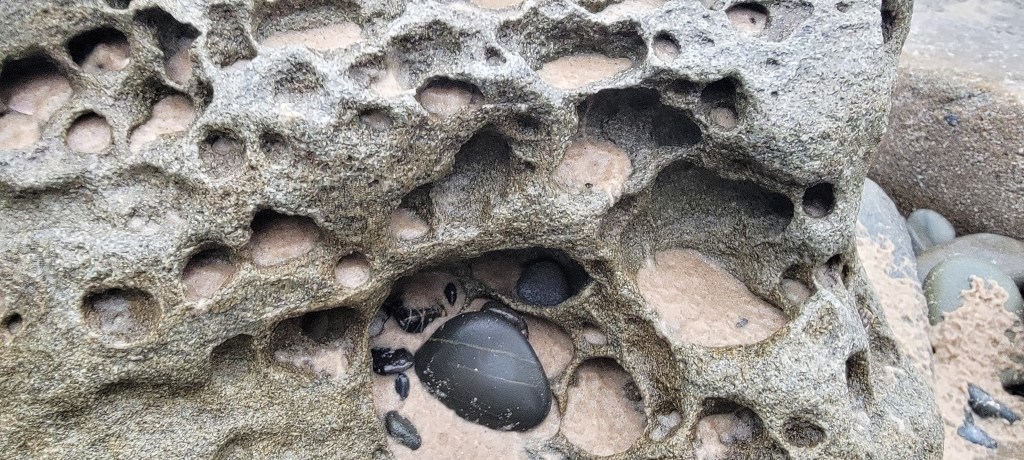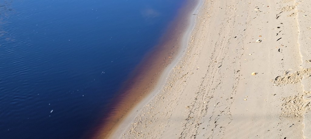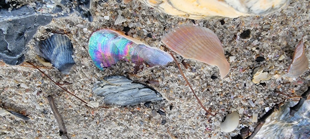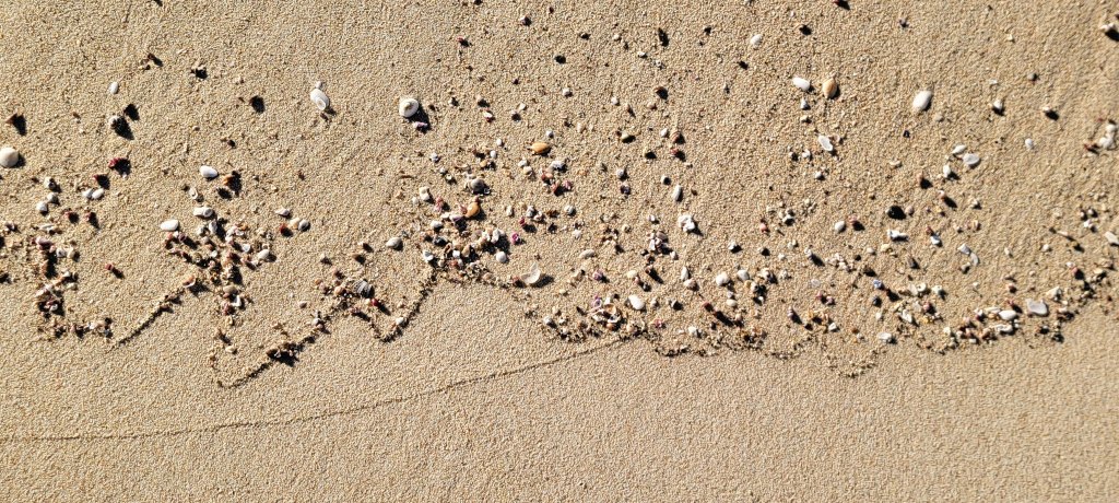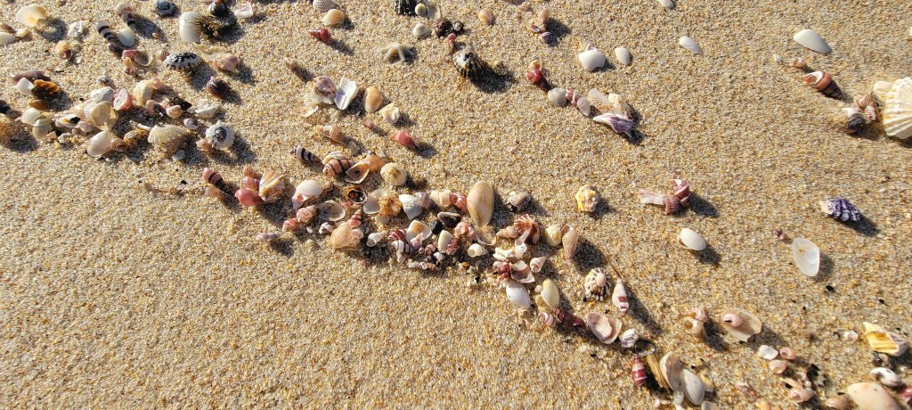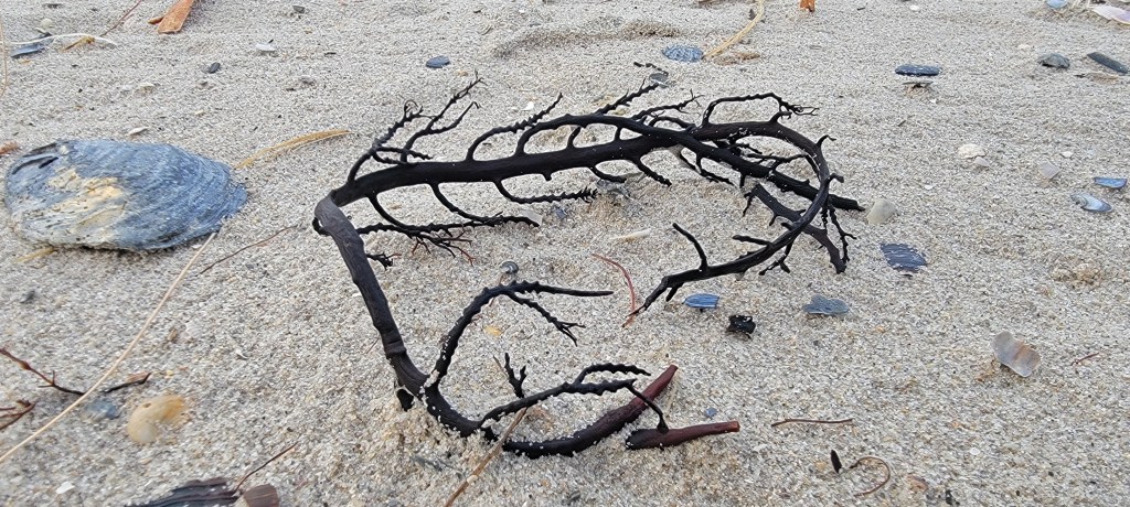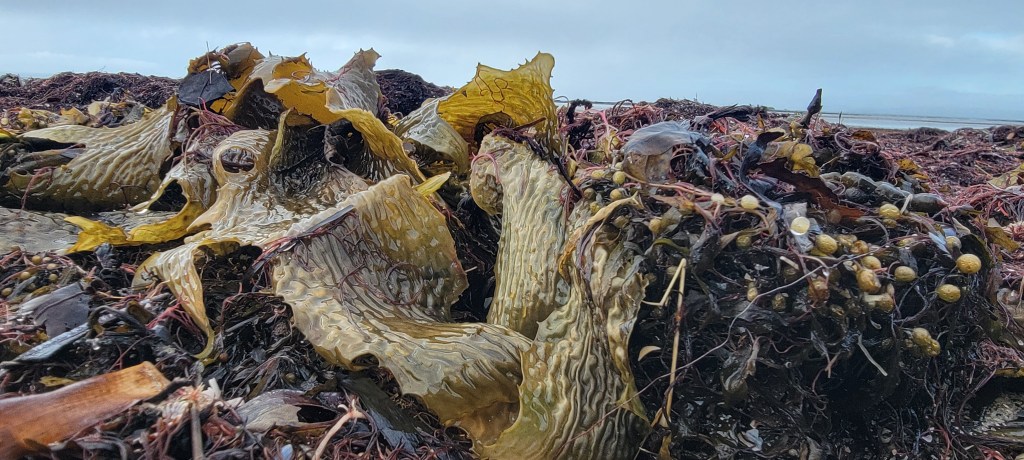 The beach shores displayed lots of ephemeral art from debris washed up by the waves, birds fallen feathers and remains of marine or land wildlife. Marine vegetation such as seaweed artistically seen gathered together in piles or scattered across the sands. All either to be re-collected by the next tide or left to breakdown over time.